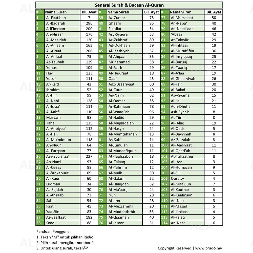 Adakah kita masih mengingati dan sentiasa alert tentangnya? Senarai 30 juzuk al quran serta surah · untuk mencapai onjektif, kita perlu kenali objektif tersebut serta membuat perancangan yang teratur, begitu juga dalam . Berikut ingin saya kongsikan senarai 114 .